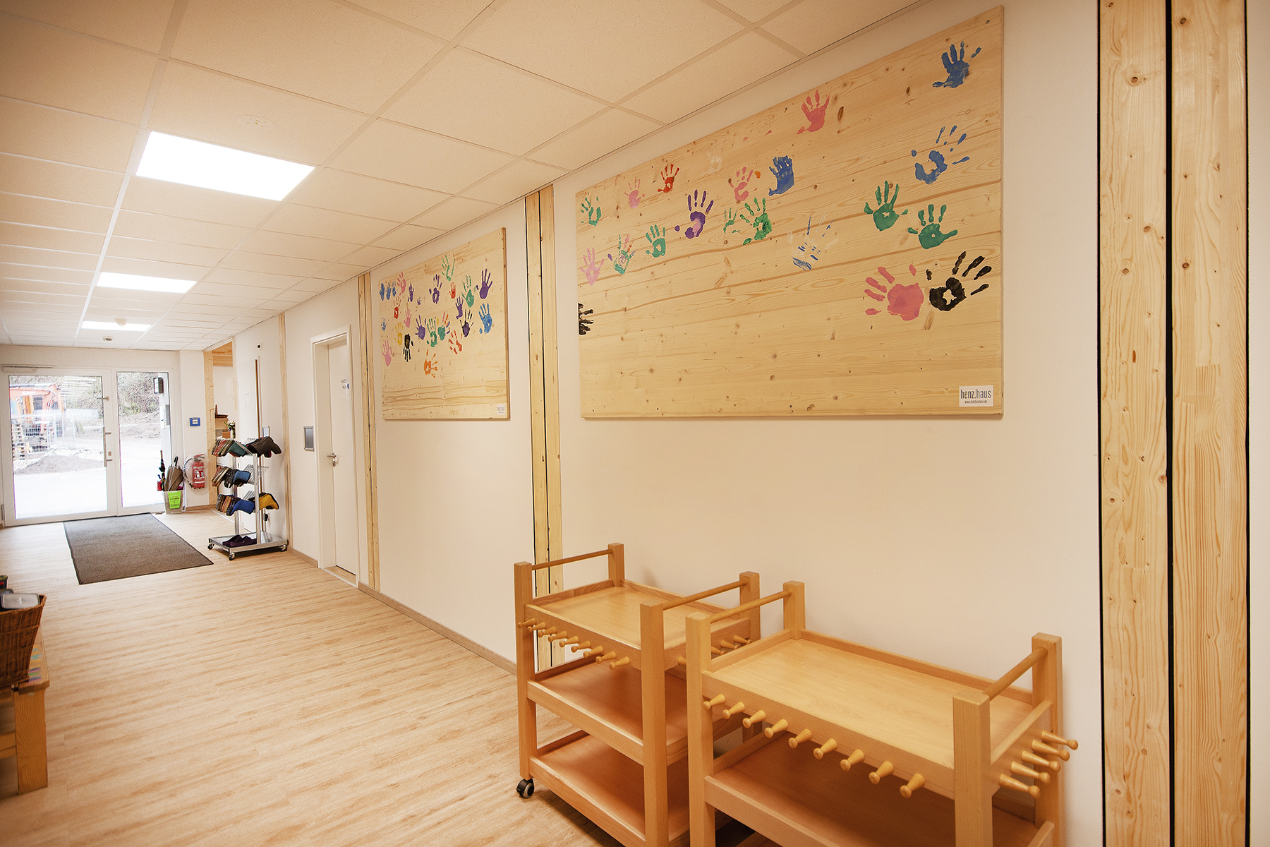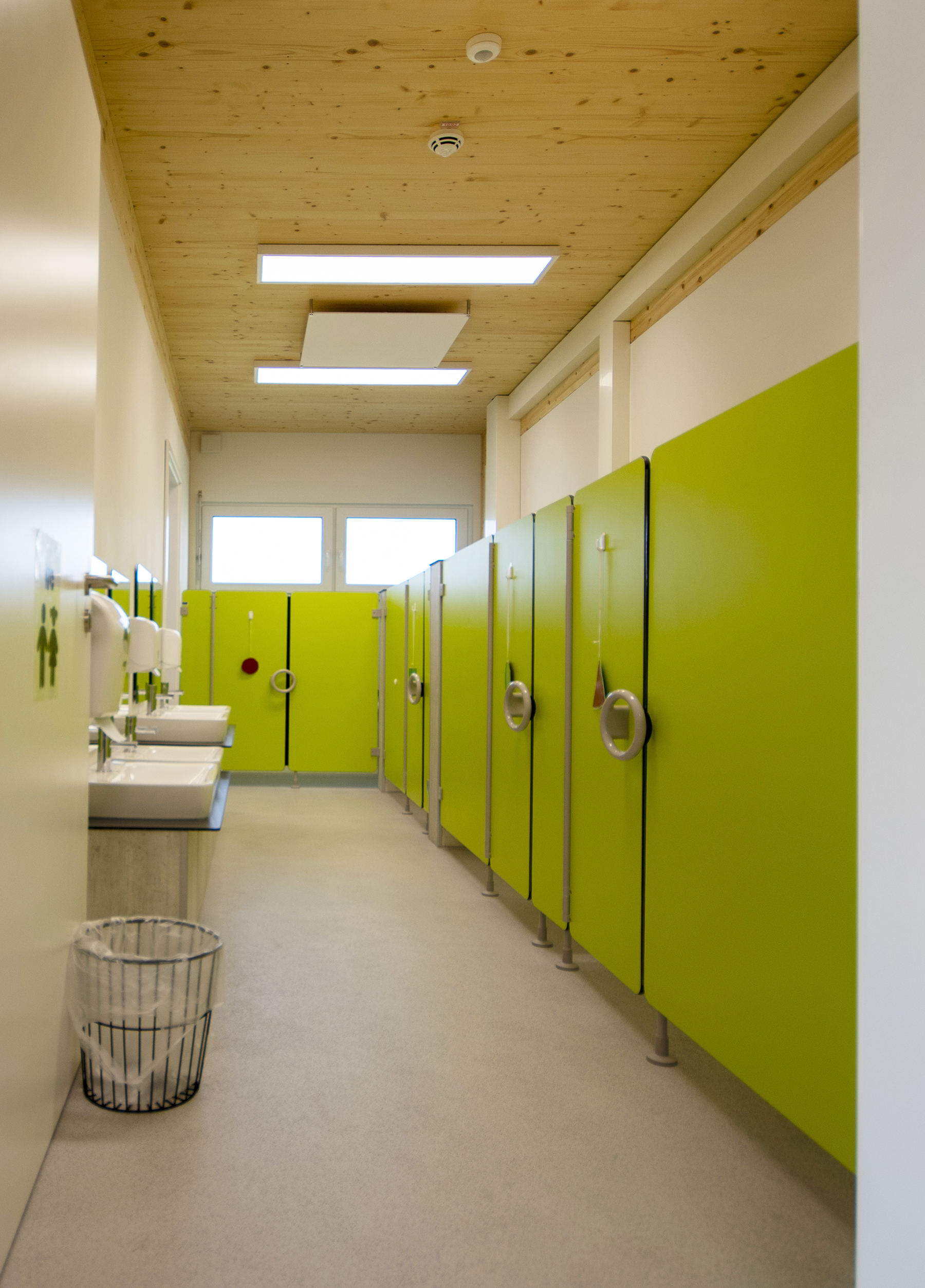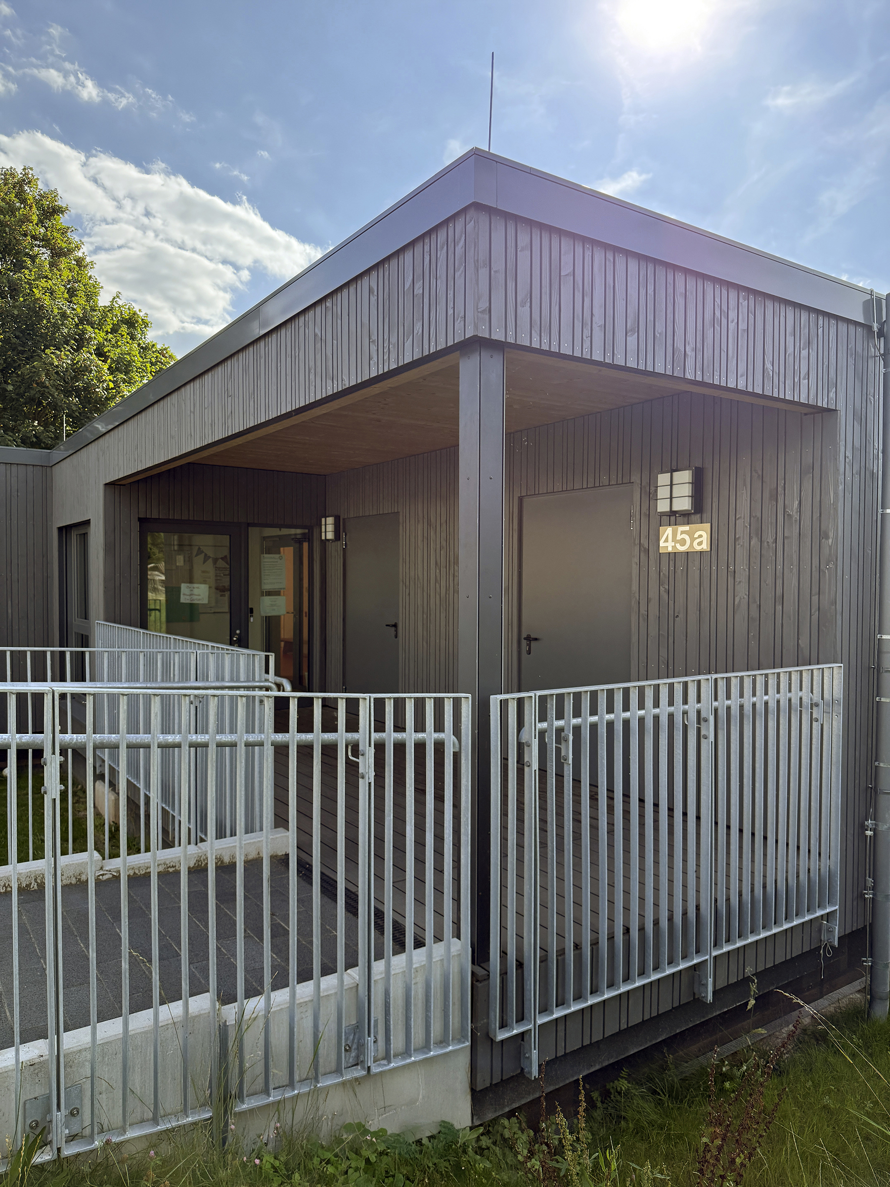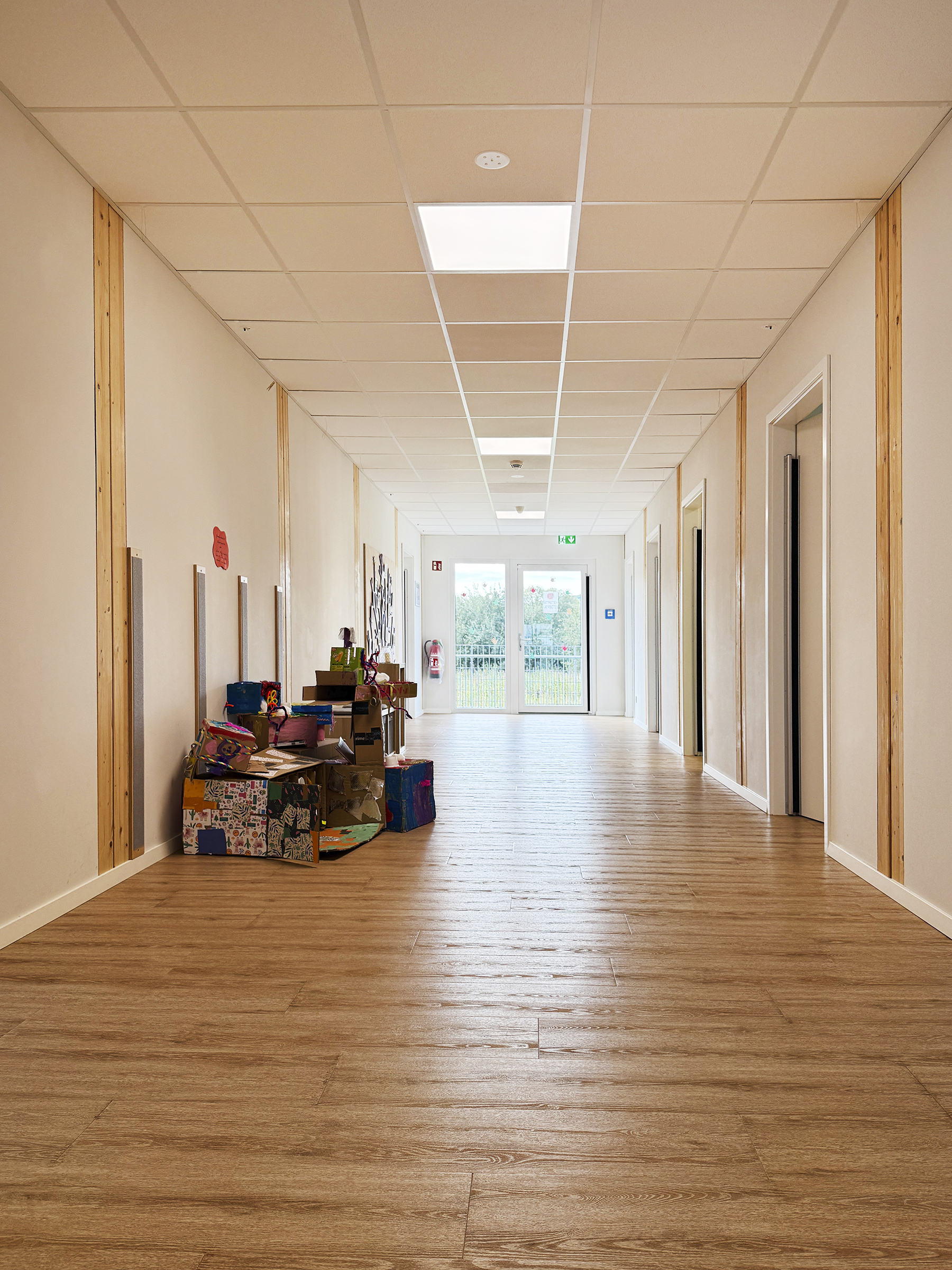 Die Module wurden in einer unserer Werkhallen produziert und vor Ort montiert. Sicherheitsmaßnahmen wie Fingerklemmschutz an den Türen, Heizlastberechnung nach DIN Normen, Einhaltung von Brandschutznormen, Einbau von Akustikdecken und ein Technikmodul für die Versorgung der Module sind integraler Bestandteil des Projekts.